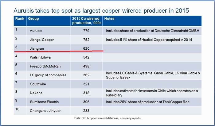 日前,英國商品研究所(簡稱:CRU)發布了全球銅桿生產商排名,江潤銅業位列第三。 英國商品研究所是礦產、金屬、電線電纜等行業內世界領先的權威分析機構,總部位于倫敦,全球擁有各國專家超過250人,包括經濟學家、管理顧問、工程師、冶金學家、地質學家、化學家及媒體從業人員。多年來,英國商品研究所作為世界知名的金屬市場分析及咨詢公司,以其獨立性和權威性得到行業內的廣泛認可,其分析報告和數據統計被行業內普遍采用和參考。公司擁有兩條年產35萬噸SCR-7000銅連鑄連軋生產線,2015年生產銅桿62萬噸;深加工裸銅線25萬噸、鍍錫銅線2萬噸、束絞銅線6萬噸。江潤銅業專心、專業、專注于銅導體研發制造領域近四十年,未來將繼續秉承“一流裝備技術、一流產品服務、一流客戶市場”的經營理念,以信致遠、以精至臻,穩健、進取的核心價值觀,踐行工業理想,肩負歷史使命和社會責任,引領行業發展,創建具備國際競爭力的一流銅加工企業。