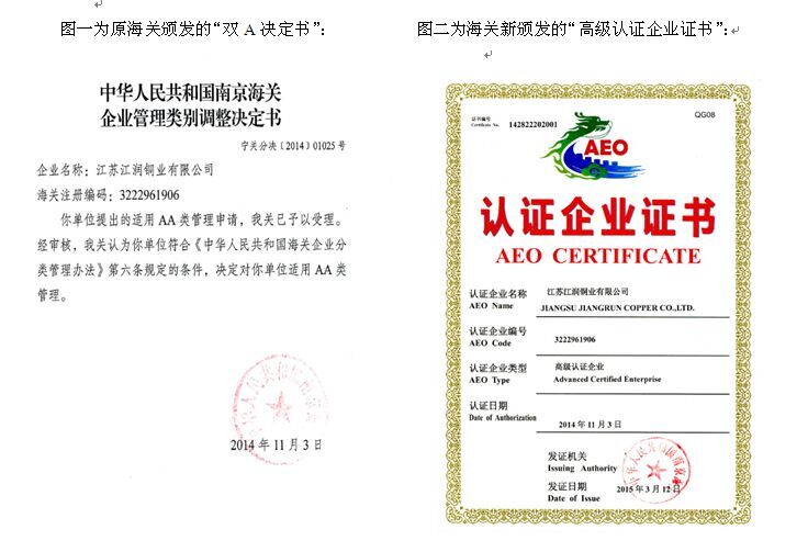 2015年7月30日,由無錫關(guān)檢貿(mào)組織的“共創(chuàng)共建”啟動(dòng)儀式在無錫隆重舉行,參會(huì)企業(yè)共十五家。會(huì)議議程為原無錫市15家海關(guān)AA類管理的企業(yè)直接過渡為海關(guān)高級(jí)認(rèn)證企業(yè)。江蘇江潤(rùn)銅業(yè)有限公司榮獲由南京海關(guān)頒發(fā)的“高級(jí)認(rèn)證企業(yè)”的稱號(hào),公司總經(jīng)理駱偉棟參會(huì)并領(lǐng)獎(jiǎng)。《中華人民共和國(guó)海關(guān)企業(yè)信用管理暫行辦法》去年12月1日實(shí)施后,海關(guān)注冊(cè)企業(yè)的管理類別從原來的AA、A、B、C、D類劃分,改為按企業(yè)信用狀況劃分為認(rèn)證企業(yè)、一般信用企業(yè)和失信企業(yè),其中認(rèn)證企業(yè)又分為一般認(rèn)證企業(yè)和高級(jí)認(rèn)證企業(yè)。認(rèn)證企業(yè)在通關(guān)時(shí)適用較低的貨物查驗(yàn)率,單證審核程序相對(duì)簡(jiǎn)化,并可以優(yōu)先辦理海關(guān)通關(guān)手續(xù)。 高級(jí)認(rèn)證企業(yè),除享有一般認(rèn)證企業(yè)的通關(guān)便利外,其進(jìn)出口貨物在確定商品歸類、原產(chǎn)地確定、海關(guān)估價(jià)和辦結(jié)其他海關(guān)手續(xù)前可先行驗(yàn)放,由海關(guān)統(tǒng)一設(shè)立協(xié)調(diào)員,提供便捷通關(guān)服務(wù)。走出國(guó)門后,高級(jí)認(rèn)證企業(yè)更可享受與中國(guó)實(shí)現(xiàn)AEO互認(rèn)國(guó)家或地區(qū)海關(guān)提供的通關(guān)便利,這相當(dāng)于直接獲得一張?jiān)谌蛴嘘P(guān)國(guó)家或地區(qū)快速通關(guān)的VIP卡。