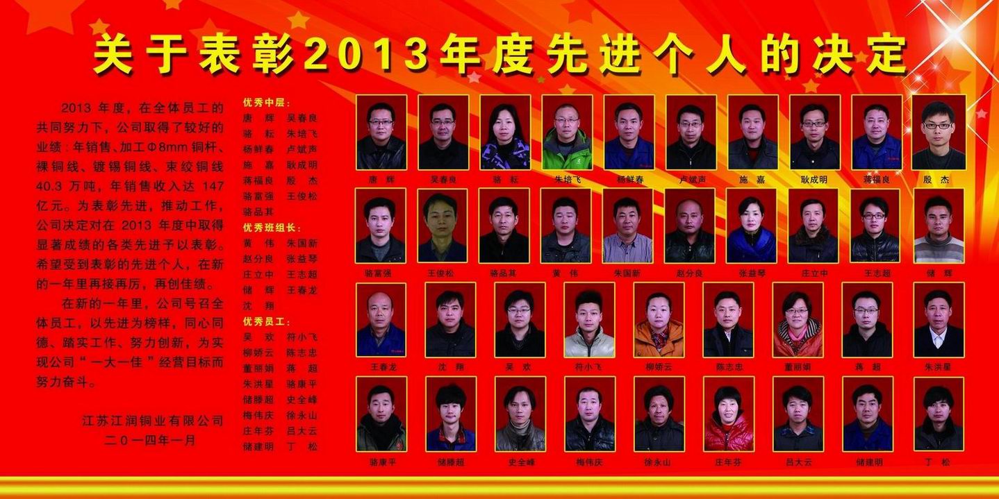 2013年度,在全體員工的共同努力下,公司取得了較好的業(yè)績:年銷售、加工Φ8mm銅桿、裸銅線、鍍錫銅線、束絞銅線40.3萬噸,年銷售收入達(dá)147億元。為表彰先進(jìn),推動工作,公司決定對在2013年度中取得顯著成績的各類先進(jìn)予以表彰。希望受到表彰的先進(jìn)個人,在新的一年里再接再厲,再創(chuàng)佳績。在新的一年里,公司號召全體員工,以先進(jìn)為榜樣,同心同德、踏實工作、努力創(chuàng)新,為實現(xiàn)公司“一大一佳”經(jīng)營目標(biāo)而努力奮斗。優(yōu)秀中層:唐 輝、吳春良、駱 耘、朱培飛、楊鮮春、盧斌聲、施 嘉、耿成明、蔣福良殷 杰、駱富強(qiáng)、王俊松、駱品其優(yōu)秀班組長:黃 偉、朱國新、趙分良、張益琴、莊立中、王志超、儲 輝、王春龍、沈 翔優(yōu)秀員工:吳 歡、符小飛、柳嬌云、陳志忠、董麗娟、蔣 超、朱洪星、駱康平、儲滕超史全峰、梅偉慶、徐永山、莊年芬、呂大云、儲建明、丁 松